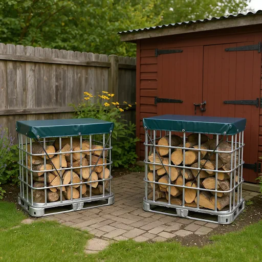 Utilisez cette cage IBC vide avec palette en métal pour stocker et faire sécher votre bois de manière ordonnée. Solide, empilable et facile à déplacer.